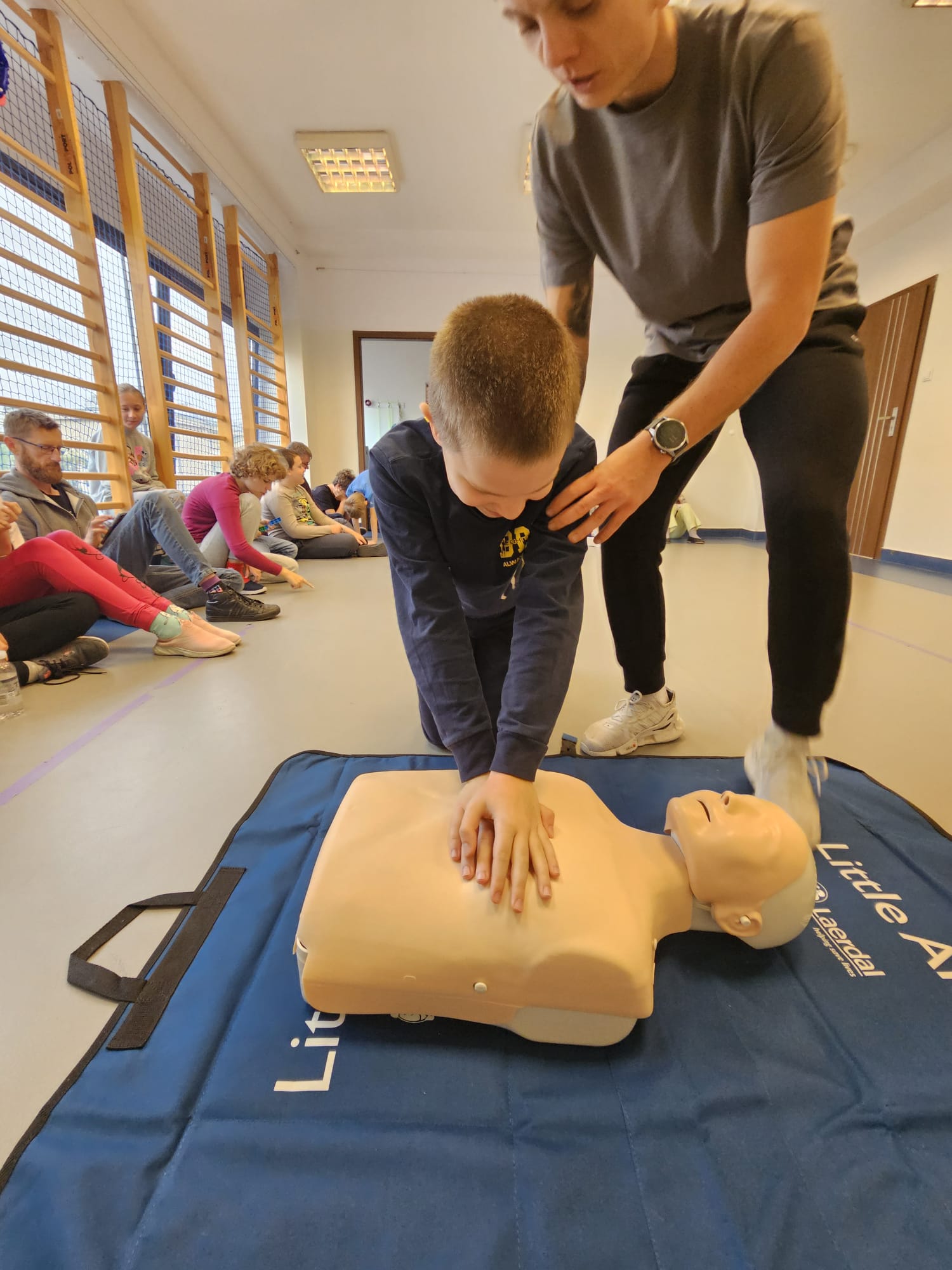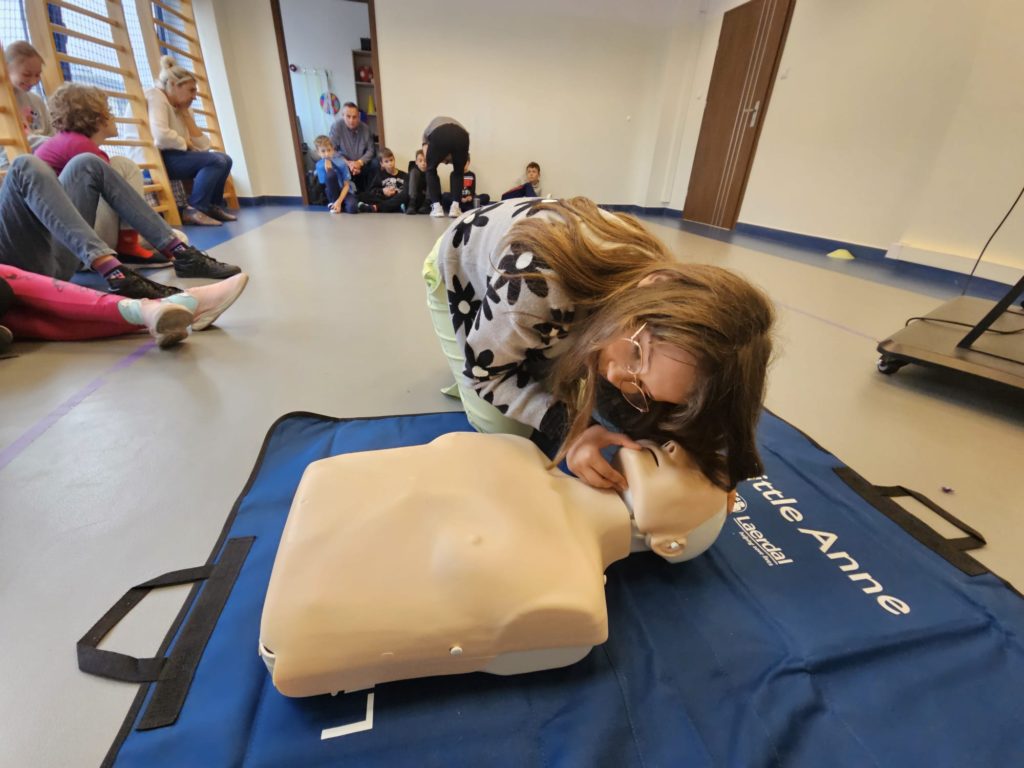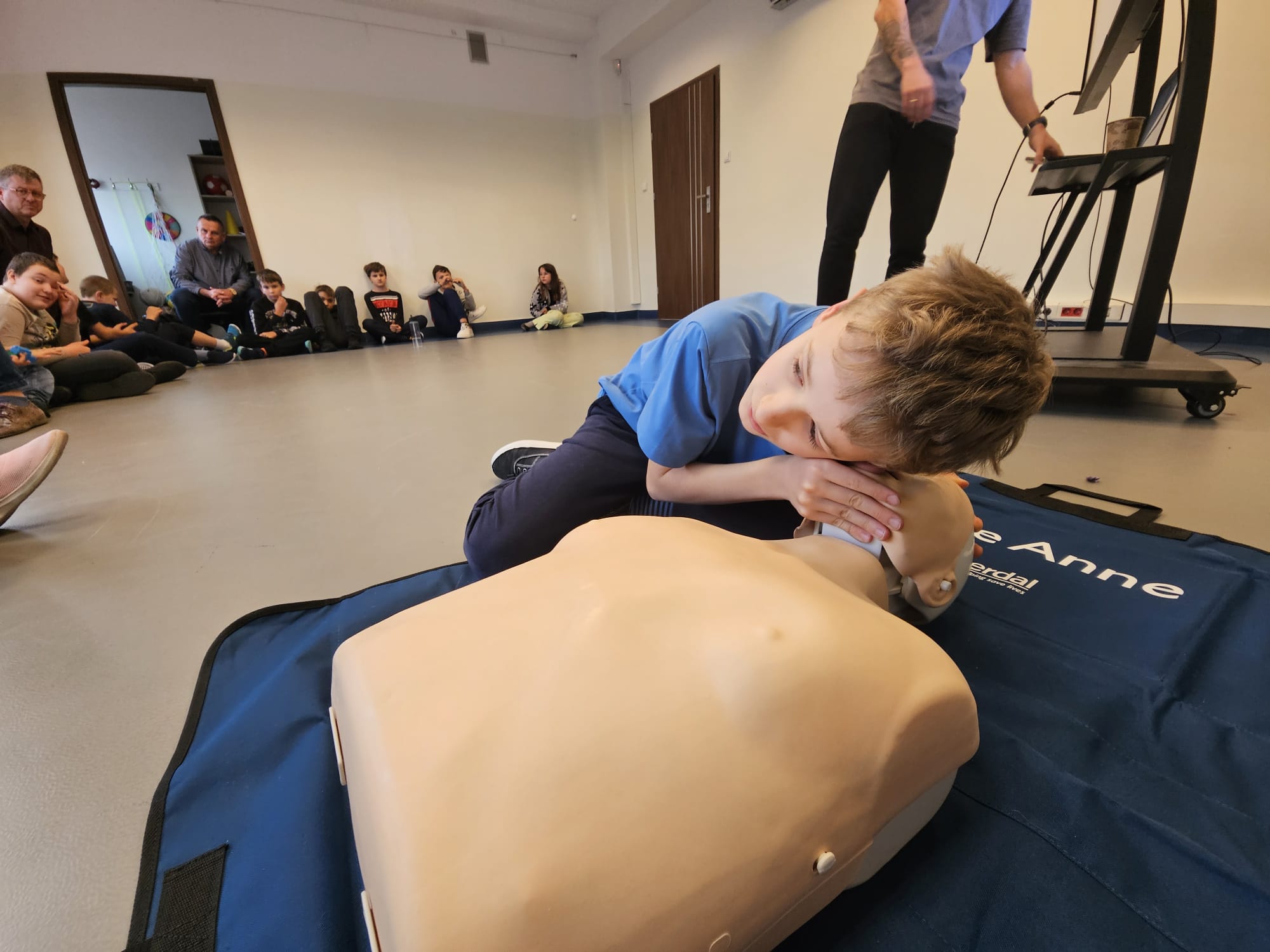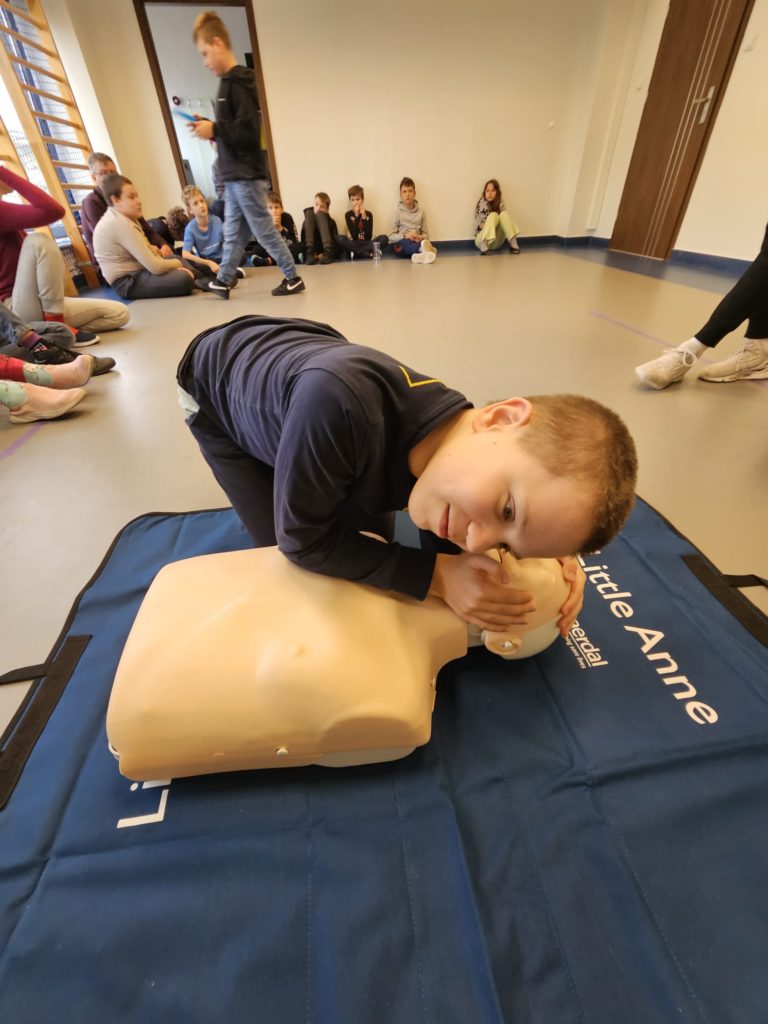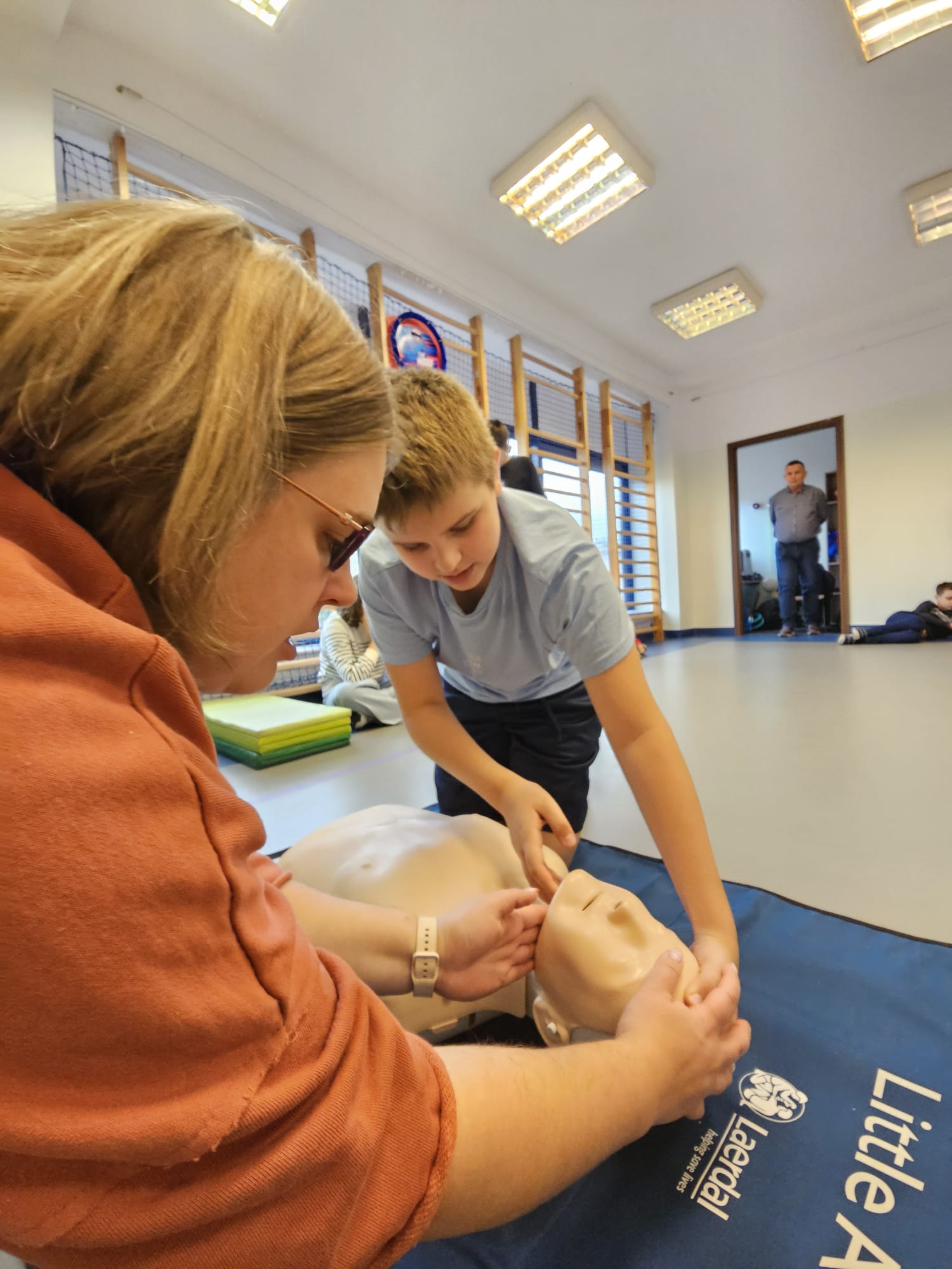 Dzisiejsze spotkanie dotyczyło pierwszej pomocy – dzieci uczyły się, jak prawidłowo wezwać pomoc, jak reagować w sytuacji zagrożenia oraz jak ułożyć poszkodowaną osobę w pozycji bocznej.