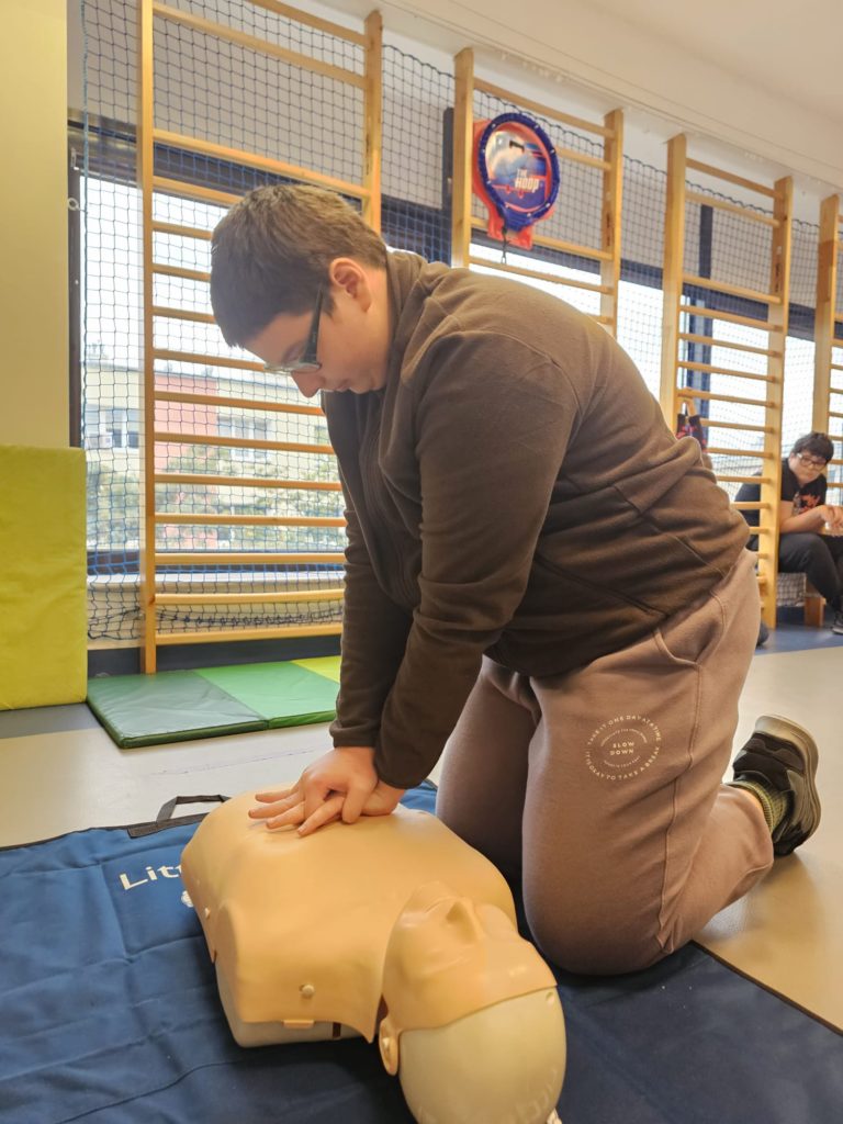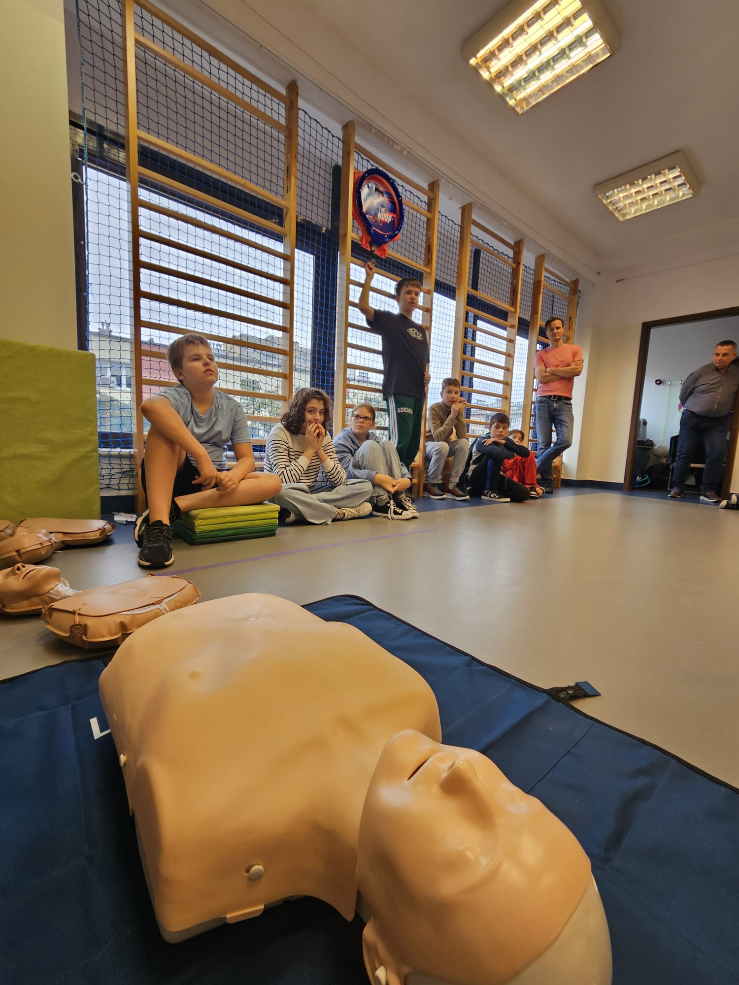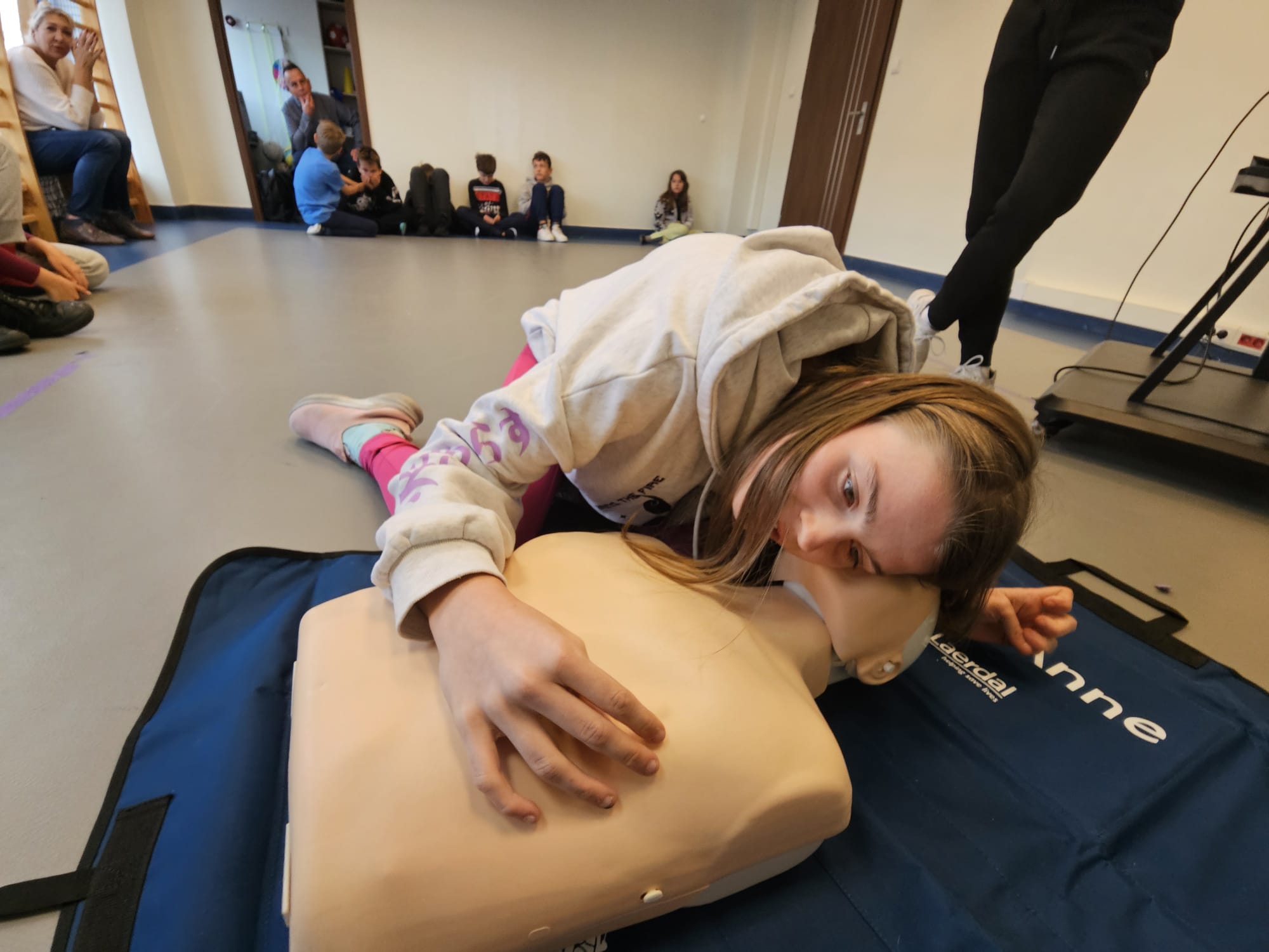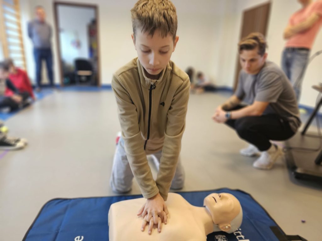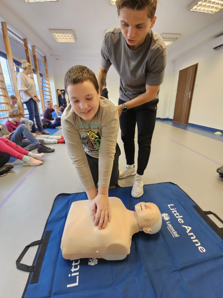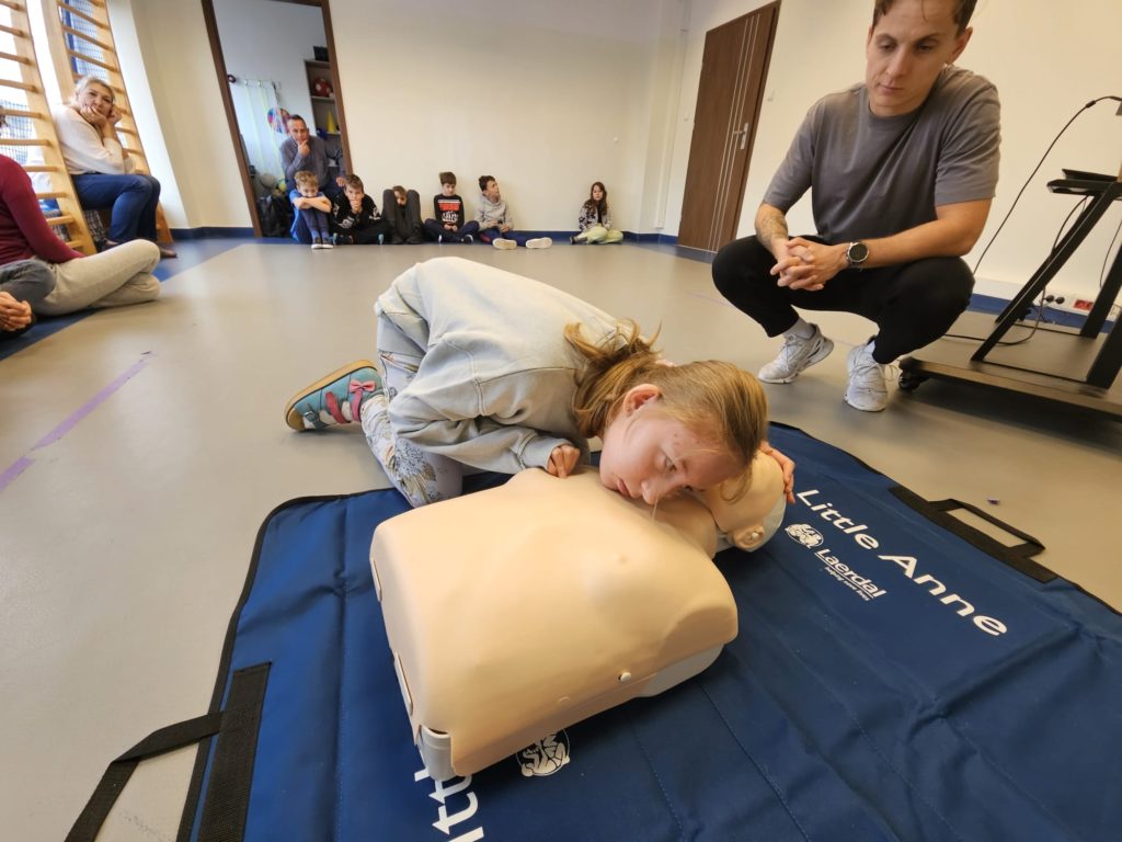 Dzisiejsze spotkanie dotyczyło pierwszej pomocy – dzieci uczyły się, jak prawidłowo wezwać pomoc, jak reagować w sytuacji zagrożenia oraz jak ułożyć poszkodowaną osobę w pozycji bocznej.