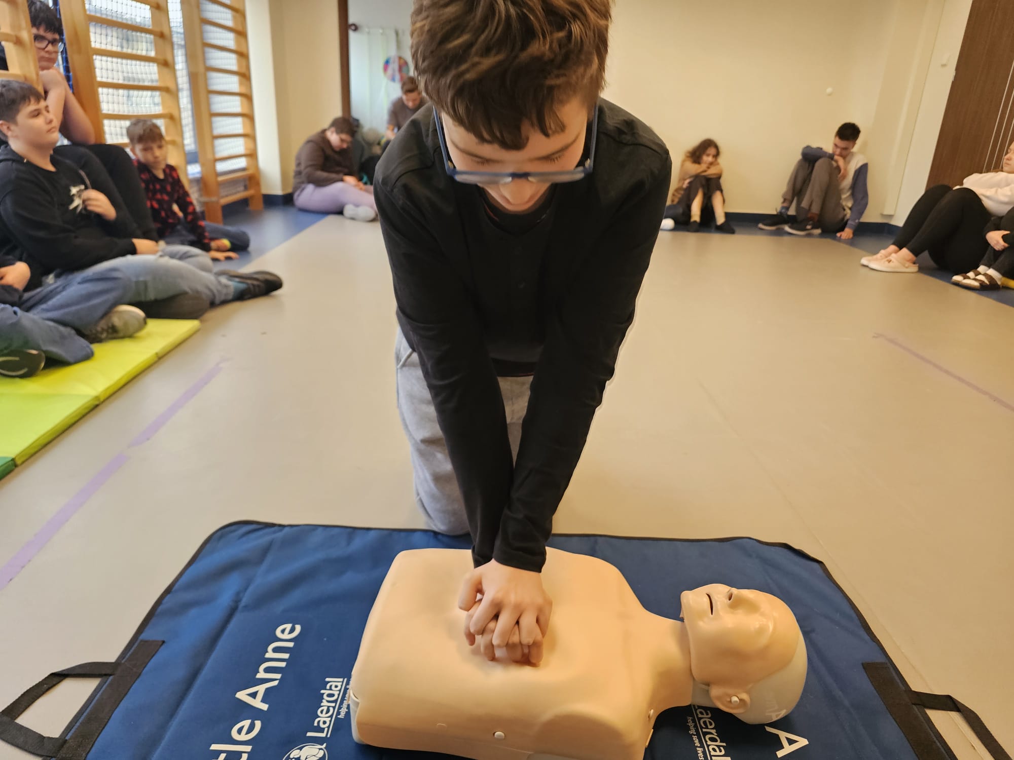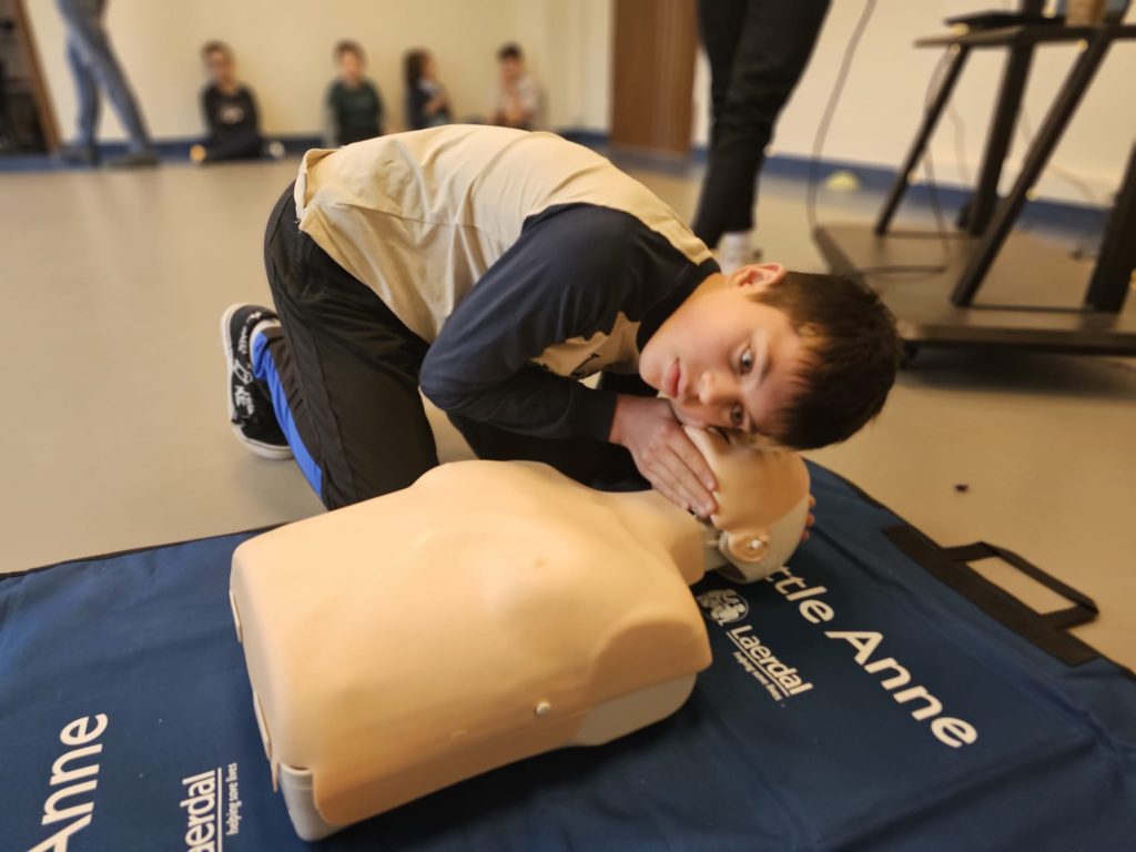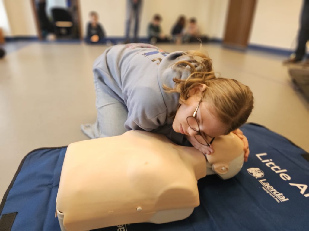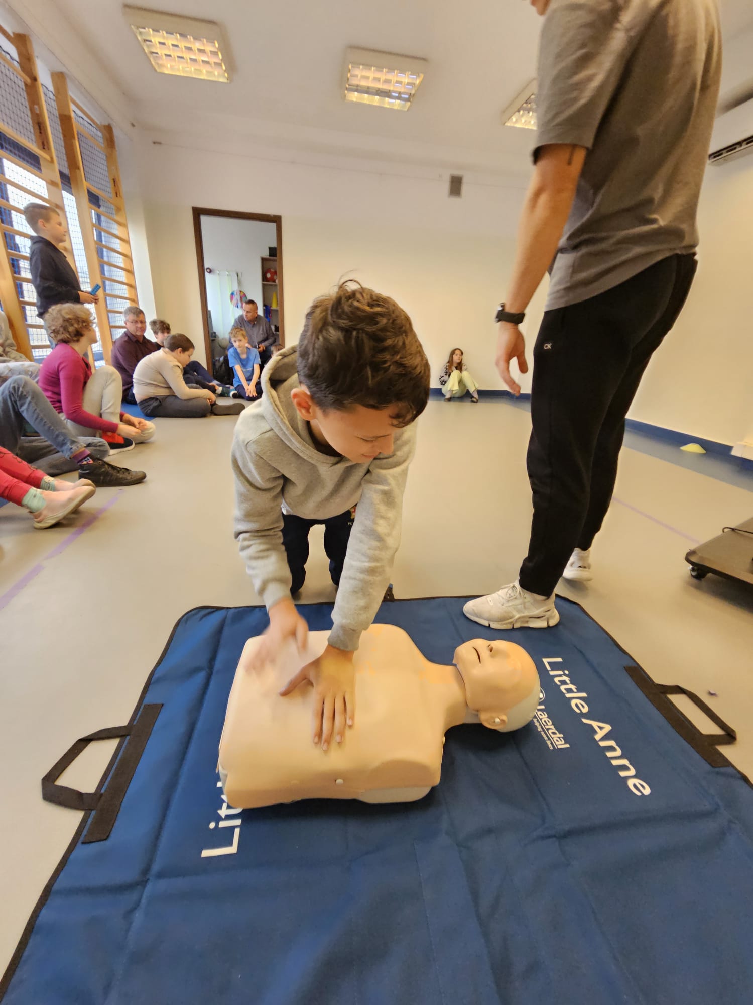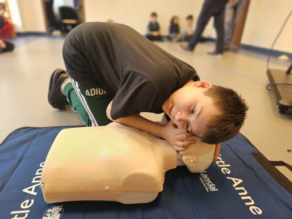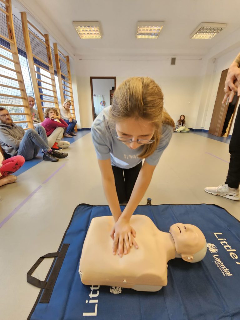 Dzisiejsze spotkanie dotyczyło pierwszej pomocy – dzieci uczyły się, jak prawidłowo wezwać pomoc, jak reagować w sytuacji zagrożenia oraz jak ułożyć poszkodowaną osobę w pozycji bocznej.