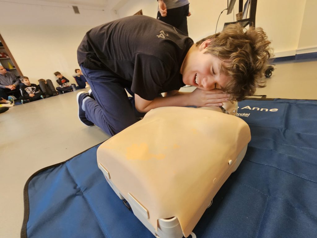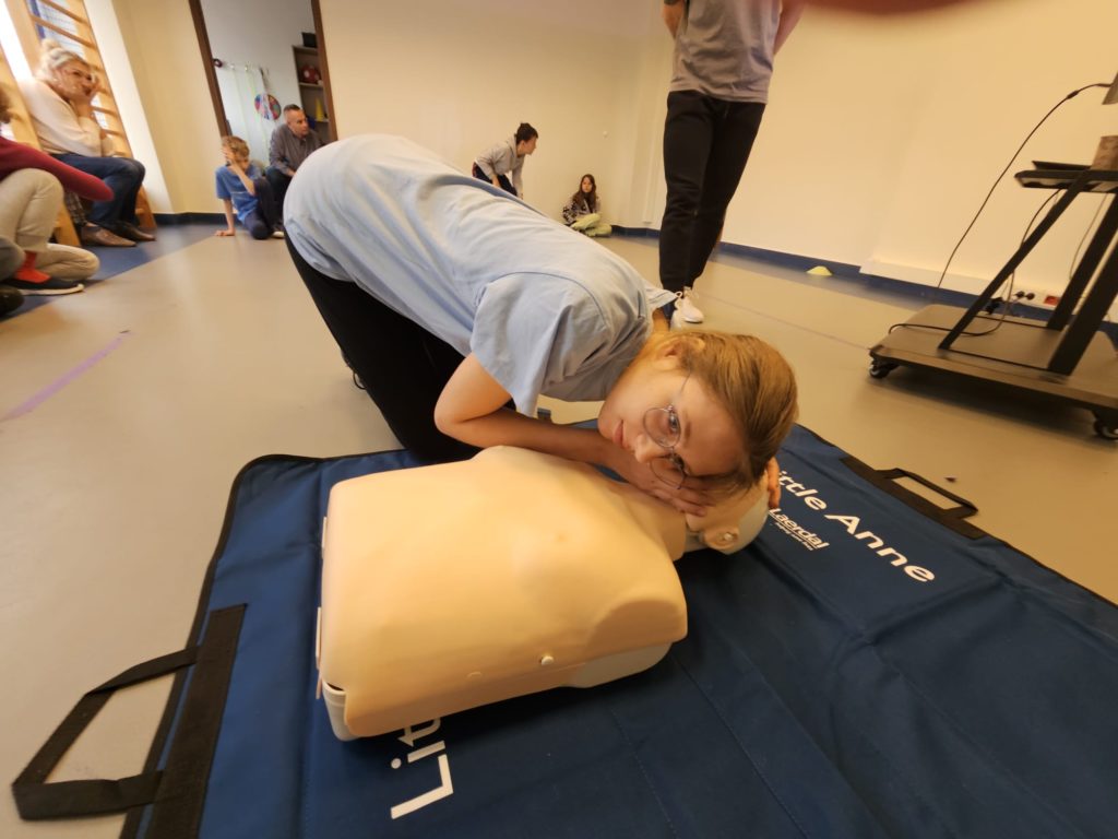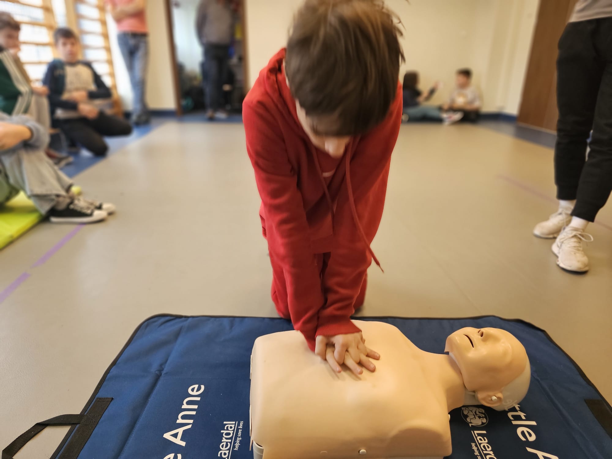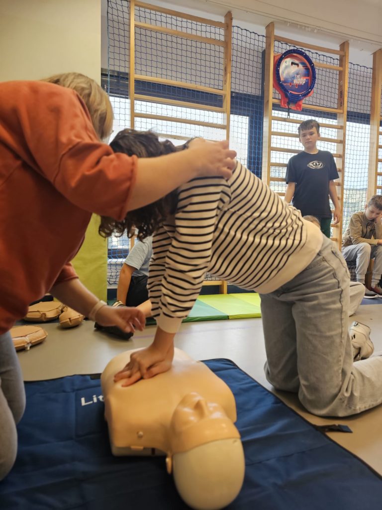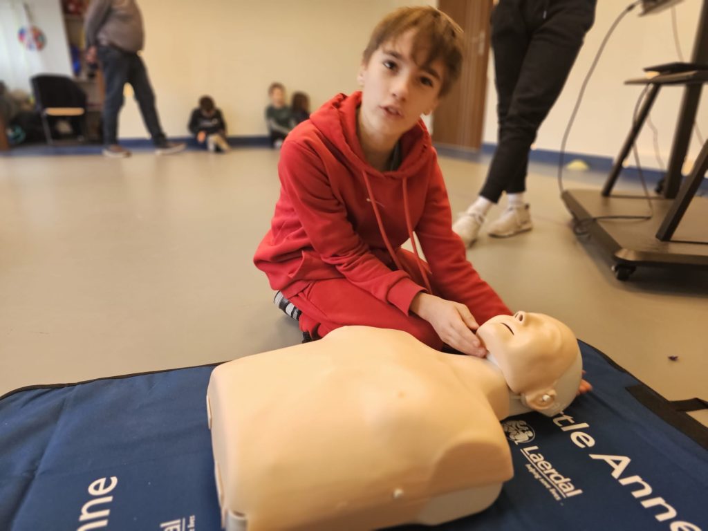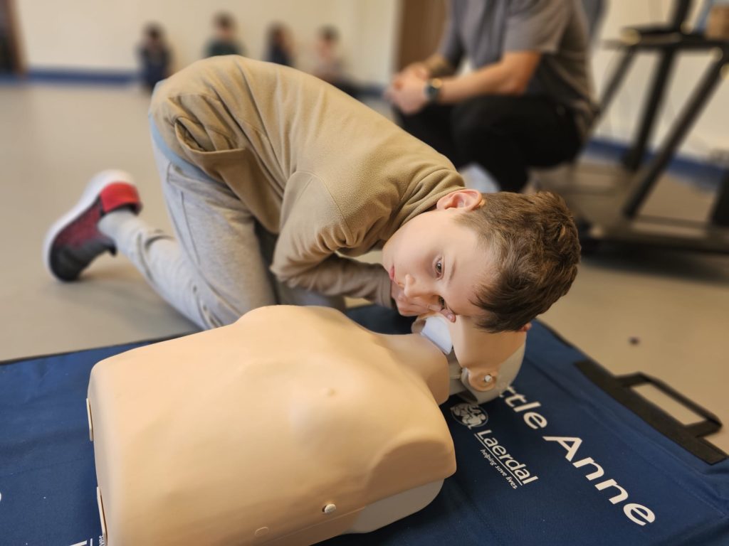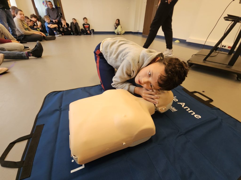 Dzisiejsze spotkanie dotyczyło pierwszej pomocy – dzieci uczyły się, jak prawidłowo wezwać pomoc, jak reagować w sytuacji zagrożenia oraz jak ułożyć poszkodowaną osobę w pozycji bocznej.